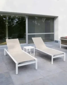 Bain de soleil Isidor en aluminium blanc. Textilène blanc ou gris. Roulettes à l’intérieur des pieds arrières.