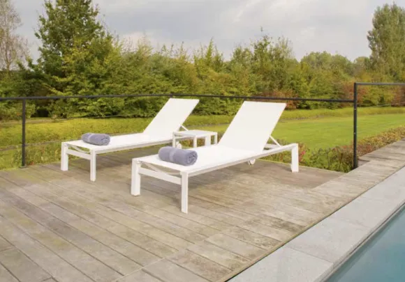 Bain de soleil Isidor en aluminium blanc. Textilène blanc ou gris. Roulettes à l’intérieur des pieds arrières.