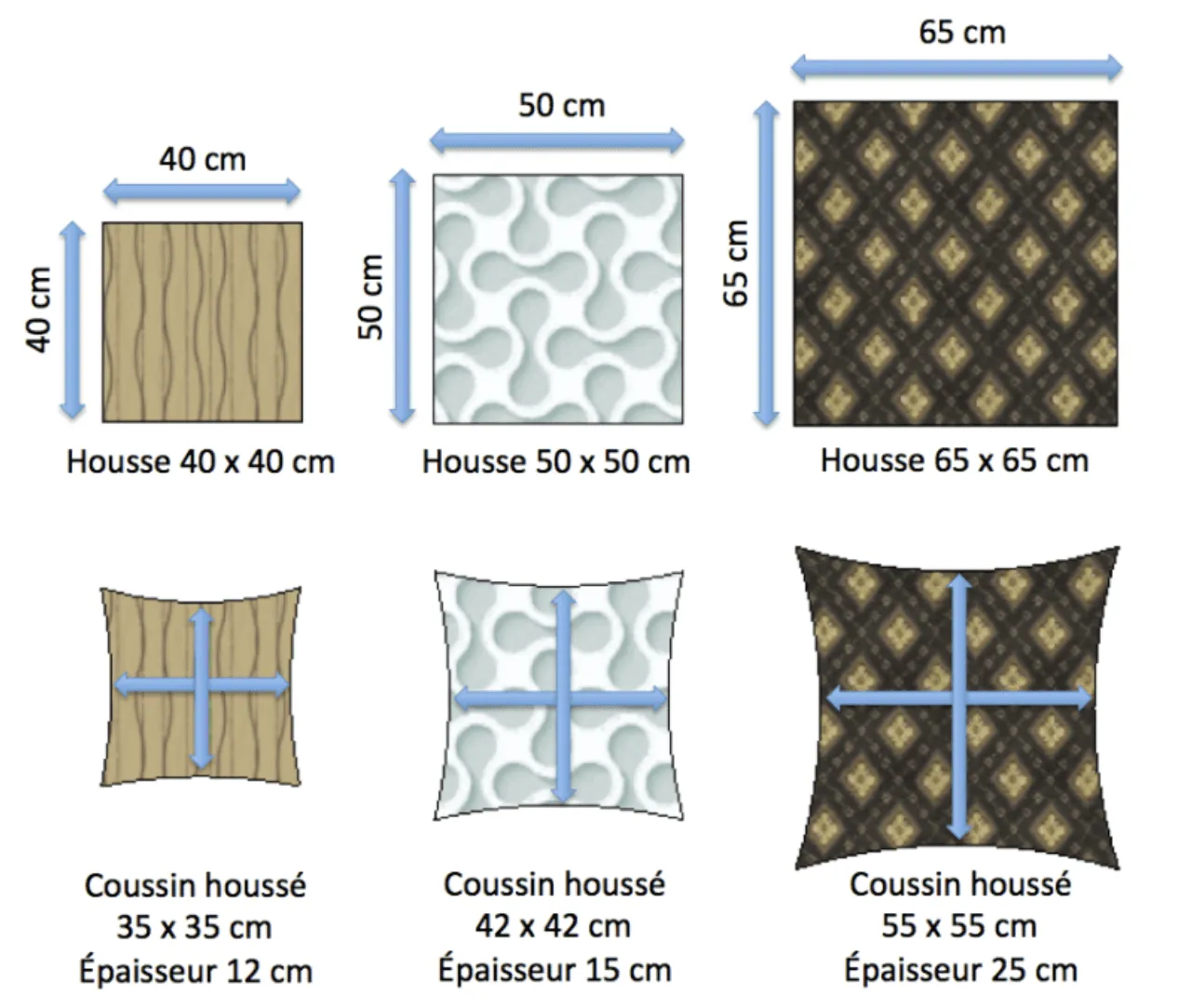 une fois houssé l’épaisseur du coussin réduit son volume. Par exemple un coussin 40 x 40 cm à un volume de 35 x 35 cm avec un épaisseur de 12 cm.
