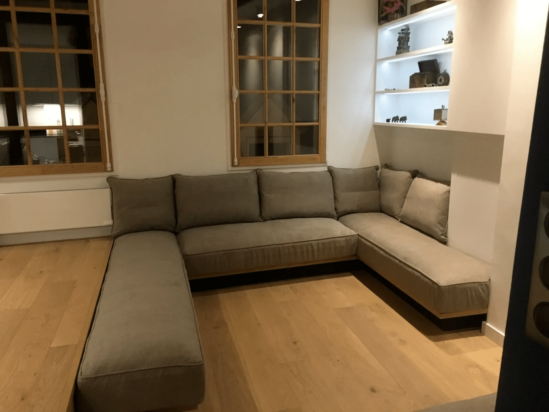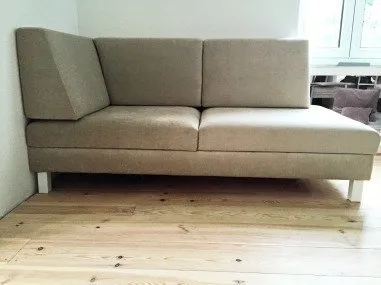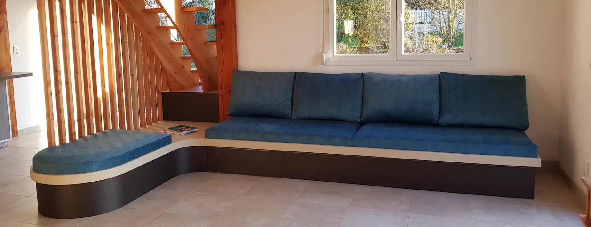 Sur une base de sommier 90 x 180 cm, nous avons pu réaliser des coussins sur mesure pour créer un vrai canapé confortable qui peut servir de couchage d’appoint en enlevant les dossiers. Les mousses bombées apportent une finition cossue et surtout un accueil très moelleux tout en ayant une assise ferme.