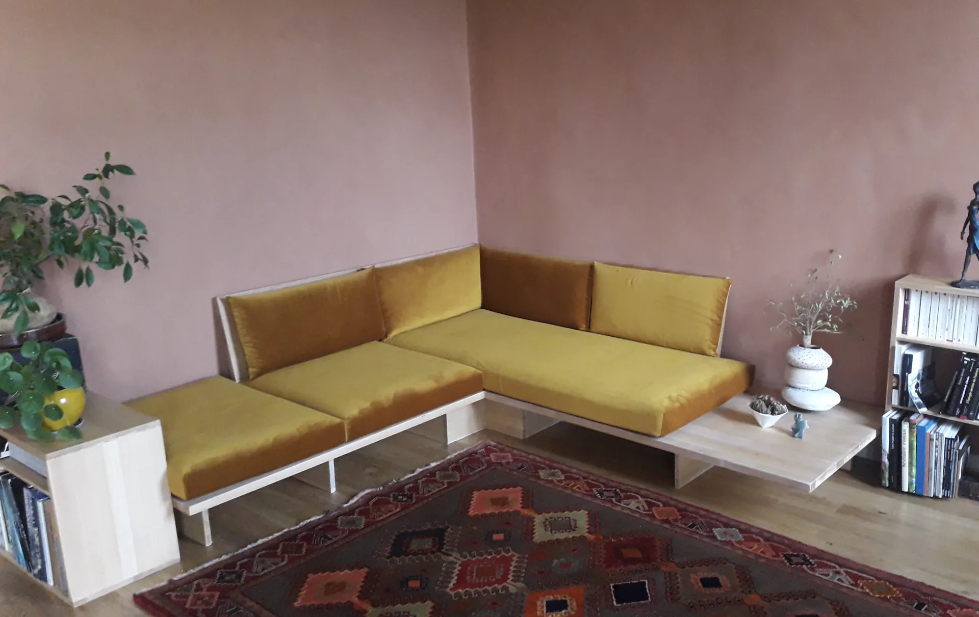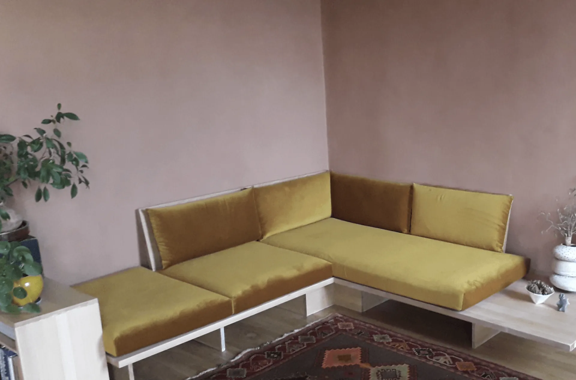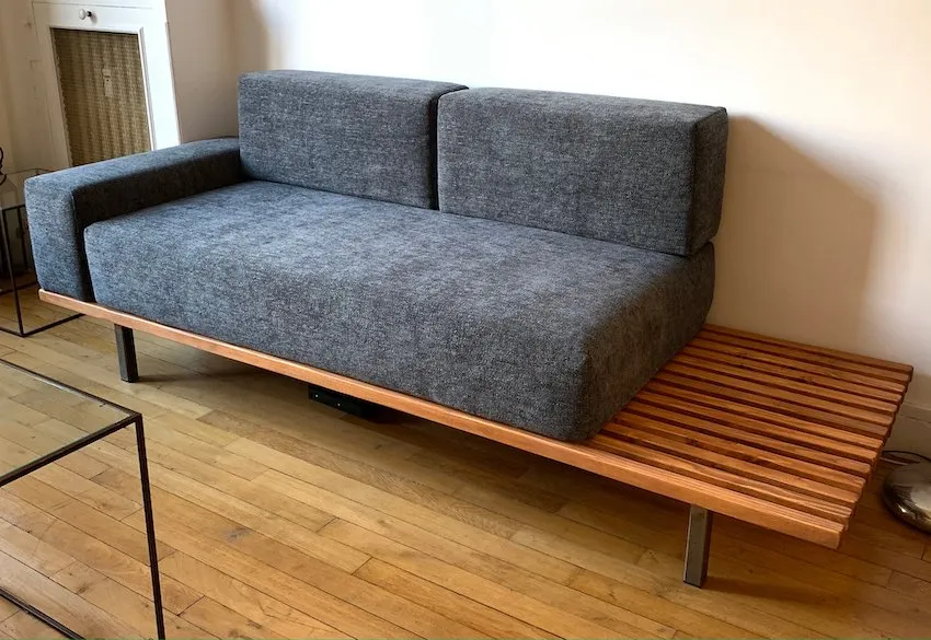 Sur une base de sommier 90 x 180 cm, nous avons pu réaliser des coussins sur mesure pour créer un vrai canapé confortable qui peut servir de couchage d’appoint en enlevant les dossiers. Les mousses bombées apportent une finition cossue et surtout un accueil très moelleux tout en ayant une assise ferme.