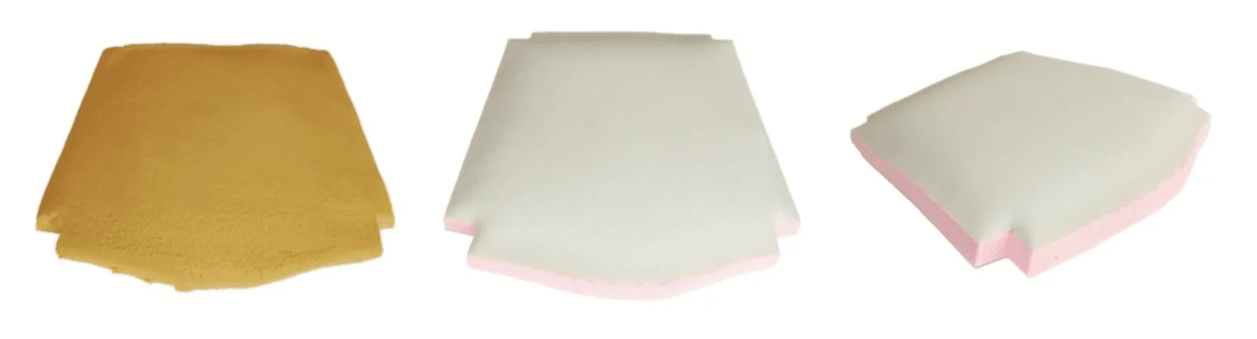 Exemple de mousse d’assise avec un bombé. La mousse principale apporte la portance de votre assise, généralement en HR40 kilos ou Bultex. La mousse du bombé est en HR28 kilos Soft. Elle apporte un accueil moelleux pour un confort optimal. Une mousse bombé permet également d’avoir toujours le tissu tendu ce qui embellit vos assises.