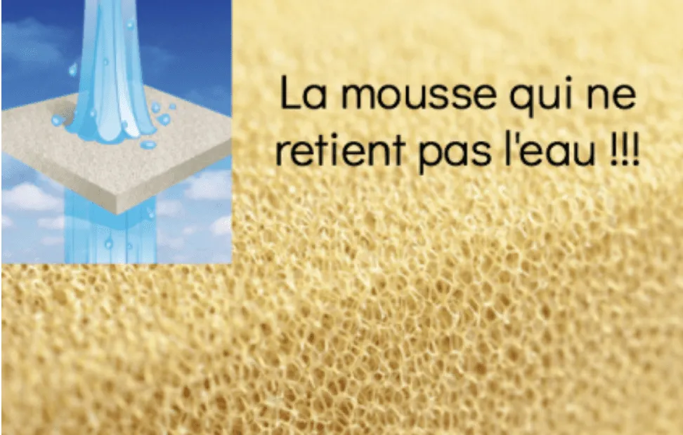 Lorsque l’on fabrique des coussins avec de la mousse Dry Feel, on réalise toujours des housses qui ont le fond en grille aérée de manière à laisser l’eau, qui a pu traverser la mousse, s’échapper. La mousse ne retient pas l’eau il faut que la housse ne la retienne pas également.